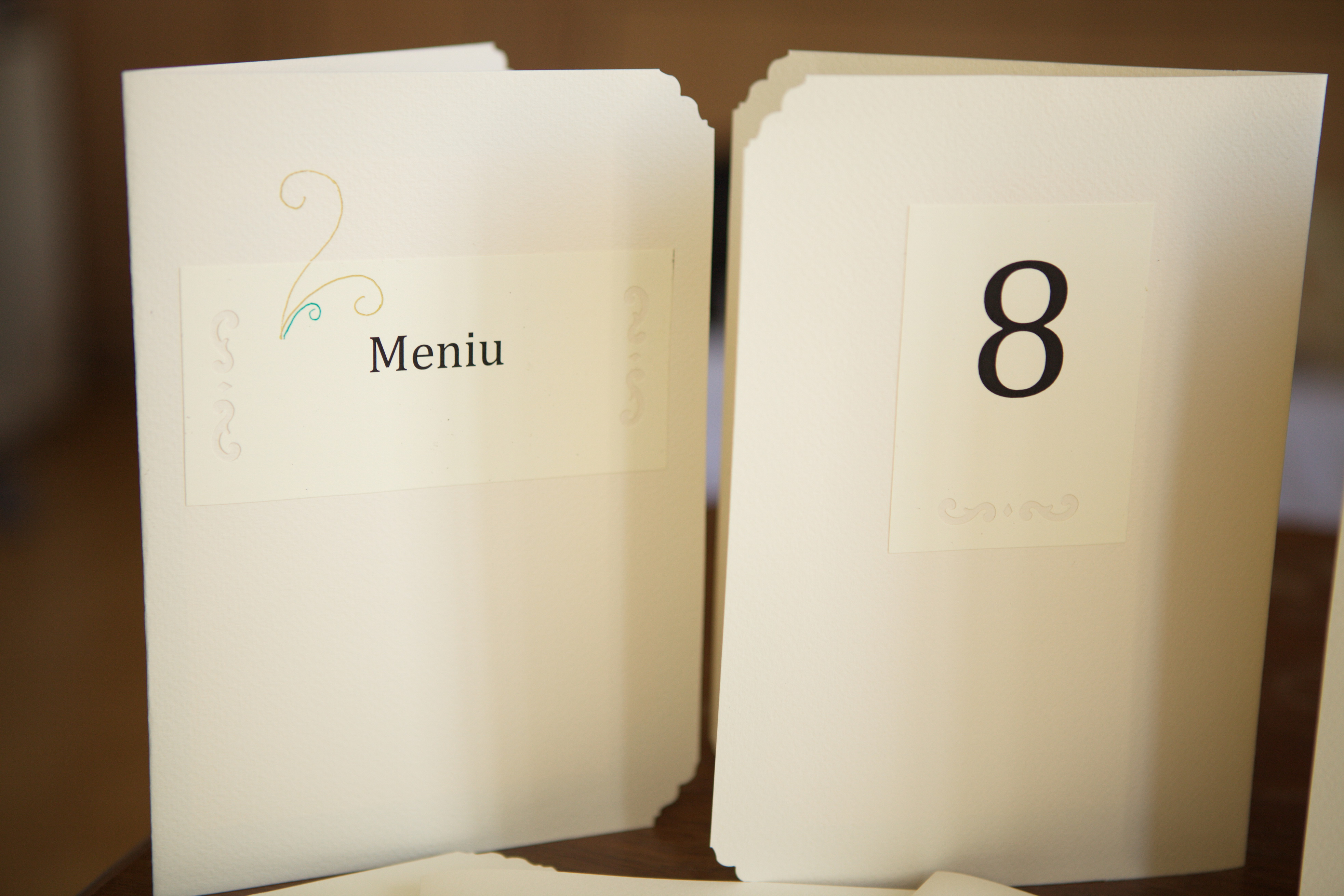Aceste meniuri au fost realizate pentru Ioana si Iuliu ..in mare graba :)…ca nu cumva sa intarzie la nunta. Ele au servit si ca numere de masa.