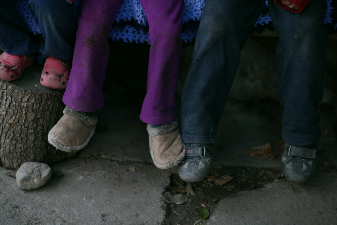 Culorile tremură de frig. Copiii se joacă pe afară neincomodați de rândurile de haine ce stau acum pe ei.