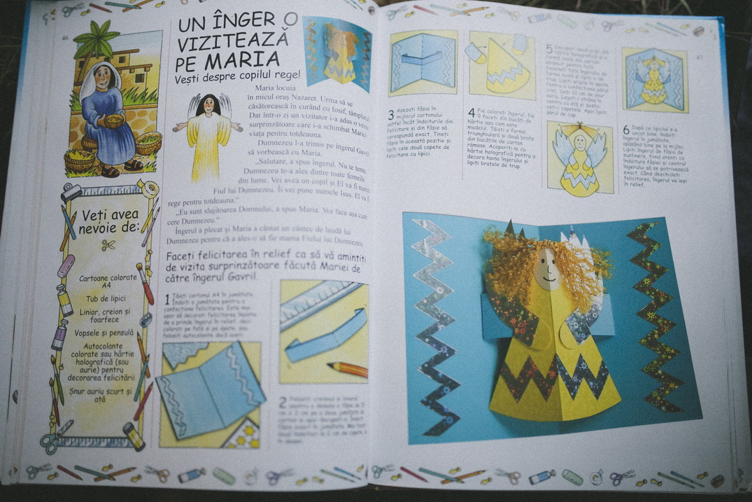 După ce am citit despre Îngerul ce i-a adus Mariei Vestea, am luat cartoanele, culorile și tot ce am avut nevoie pentru a munci la felicitările noastre.