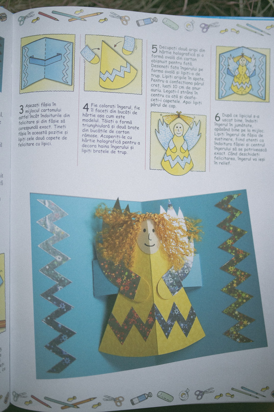 Eu am făcut un îngeraș cu păr ciufulit. Rafael mi-a spus că seamănă cu o vrăjitoare. 🙂 Avea dreptate…Am legat părul cu panglică ingustă roșie …Rafael a spus că acum seamănă cu mine…