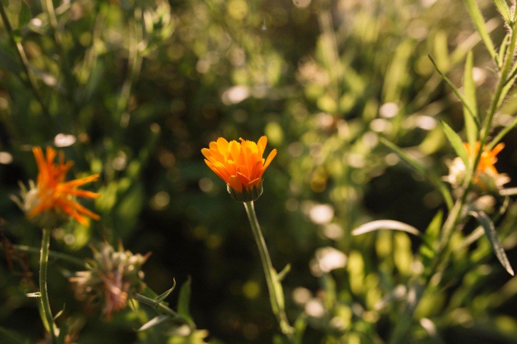 La poala dealului de piatră au înflorit târziu florile de soare, gălbenelele, cicoarea.